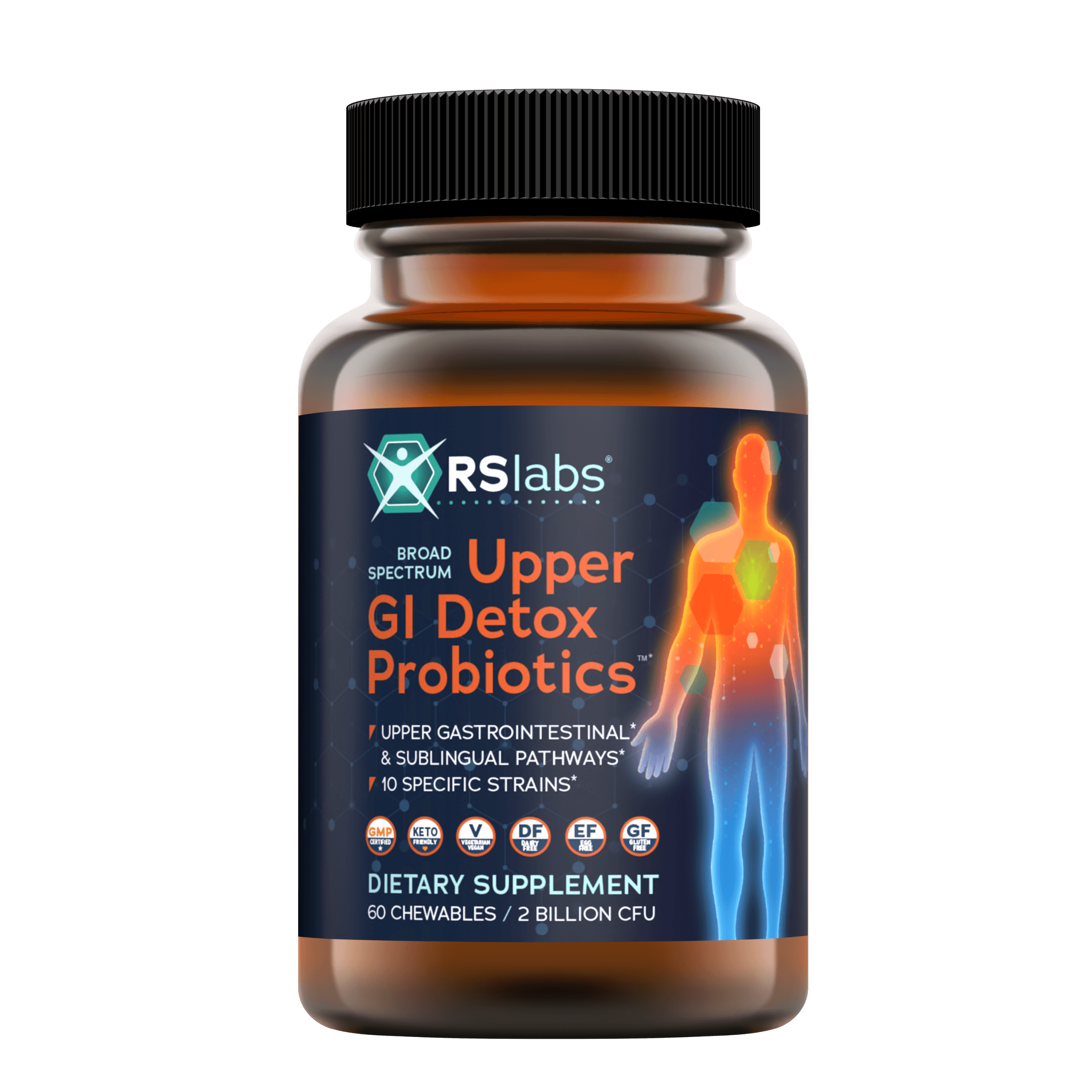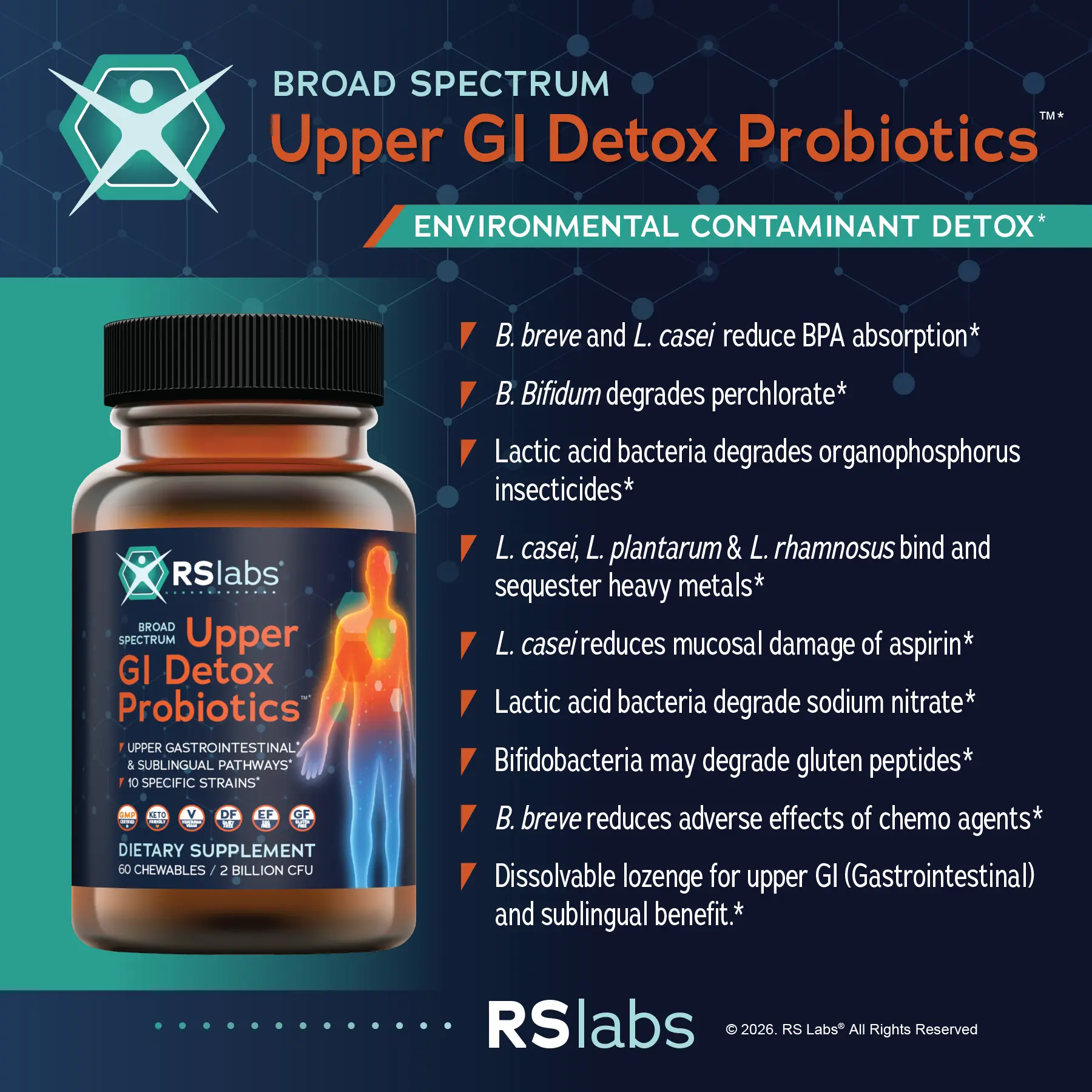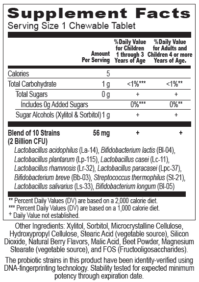 Broad Spectrum Upper GI (Gastrointestinal) Probiotics™ for Upper GI delivery is a combination of ten probiotic strains identified for their ability to degrade and remove immunotoxic chemicals, decrease GI toxin absorption, support microbiome health, and remove microcontaminants from the body.* It is designed for upper GI and sublingual absorption.* Because it is sweetened with Xylitol, this chewable tablet won’t harm teeth and tastes great.*